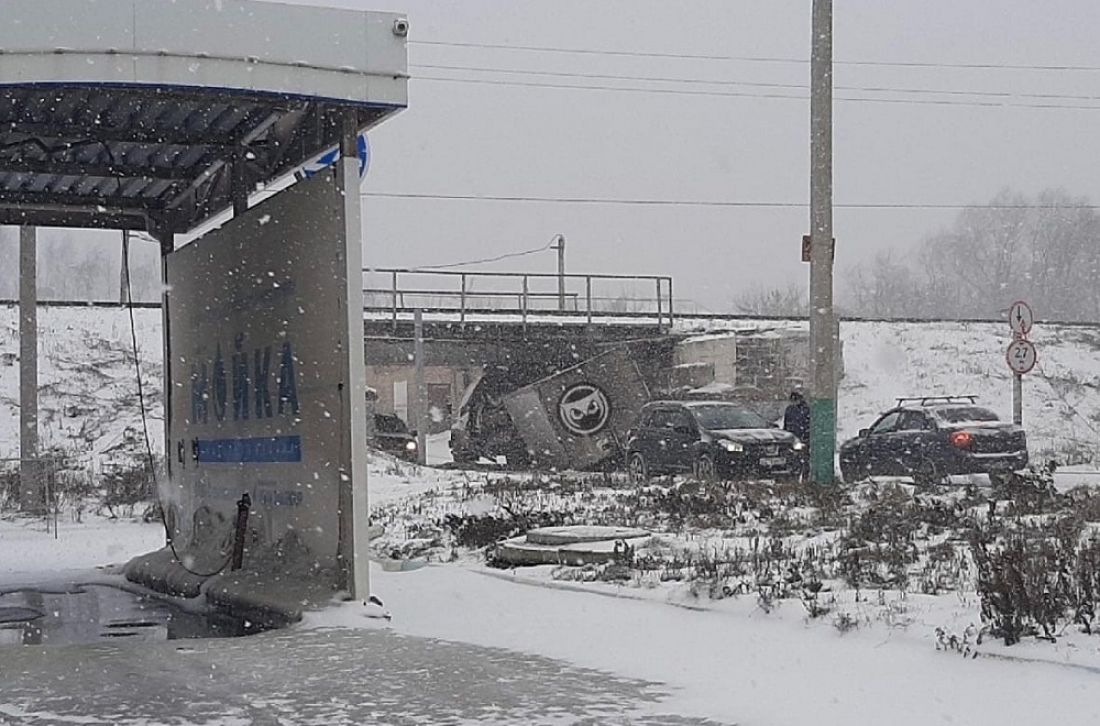 На фотографии видно, что задняя часть грузовика накренилась в левую сторону, так как не прошла по габаритам. В итоге транспортное средство застряло в туннеле, мешая проезду других автомобилей. В настоящее время на этом участке пути образовался затор.