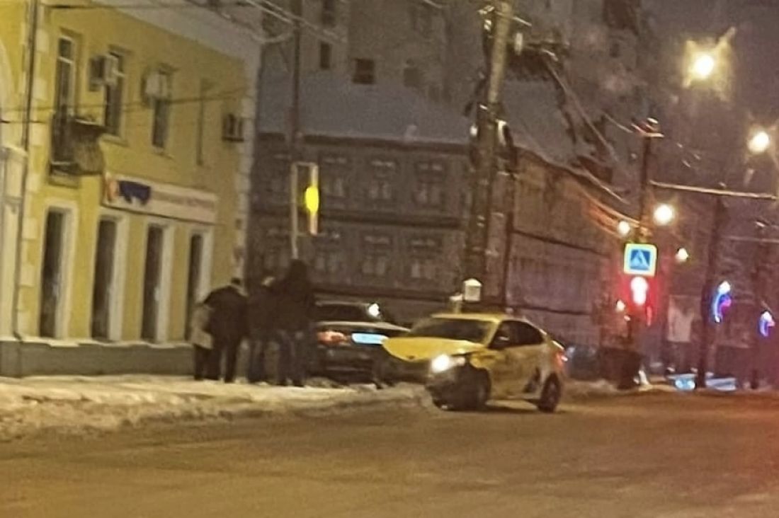 Авария произошла на пересечении улиц Кирова и Лермонтова. В одиннадцатом часу ночи там столкнулись два легковых автомобиля, один из которых имеет символику такси.