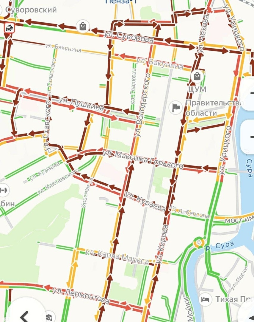И это серьезно повлияло на дорожную обстановку. Движение транспортных средств осложнено во многих районах города, а особенно в центре Пензы.