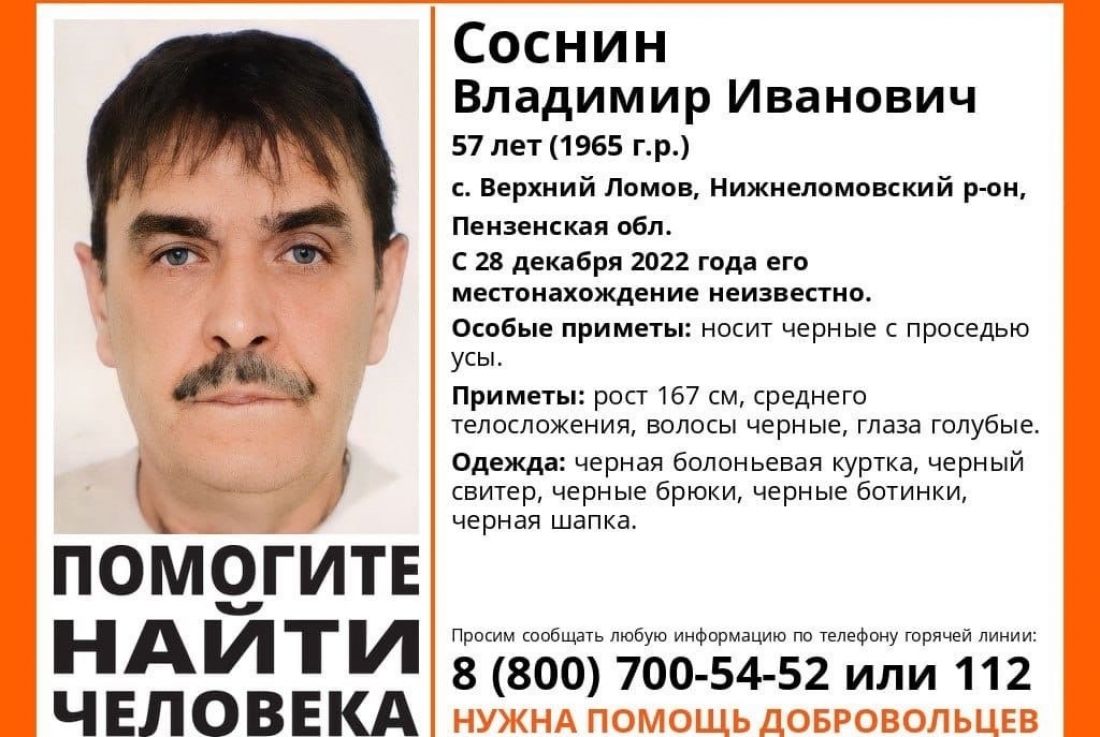 Владимир Соснин, проживающий в селе Верхний Ломов, пропал больше недели назад. Он ушел из дома 28 декабря, и с этого момента у родственников нет информации о его местонахождении.