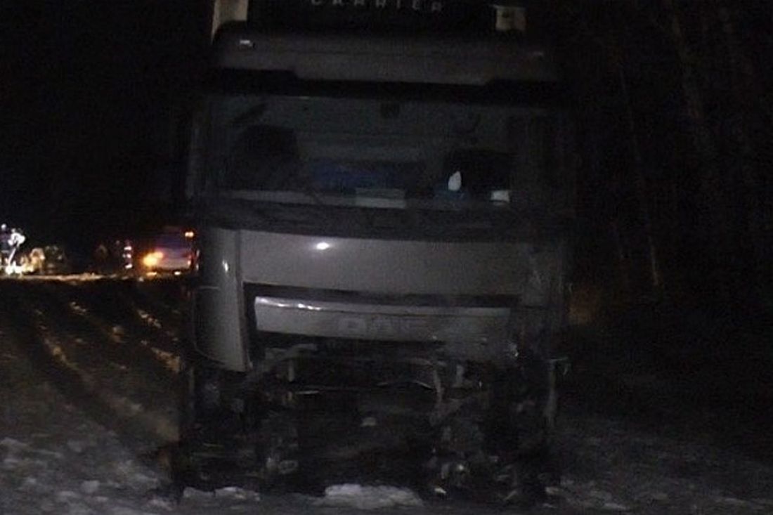 На другом можно заметить фуру, которая после столкновения вылетела с проезжей части в кювет и застряла в снегу.