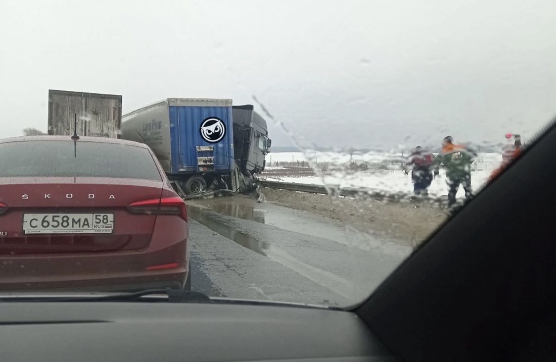 Фотографию с места дорожно-транспортного происшествия один из водителей, проезжавших мимо, опубликовал в группе «Сова Пенза авто» социальной сети «ВКонтакте». По словам автора поста, фура врезалась в отбойник на встречной полосе. Информации о пострадавших пока не поступало.