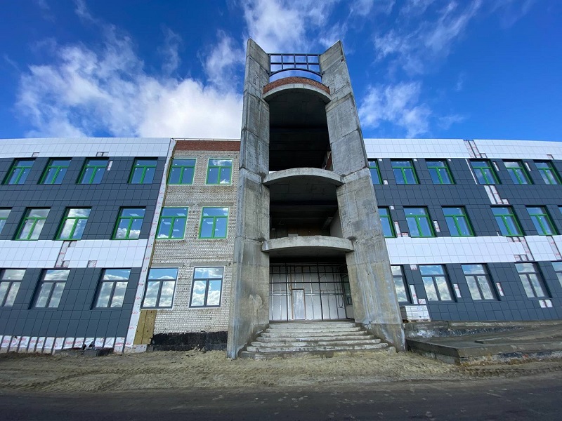 Строительно-монтажные работы выполнены на 85%, сейчас ведутся отделочные работы, оснащение классов мебелью, обустройство актового зала.