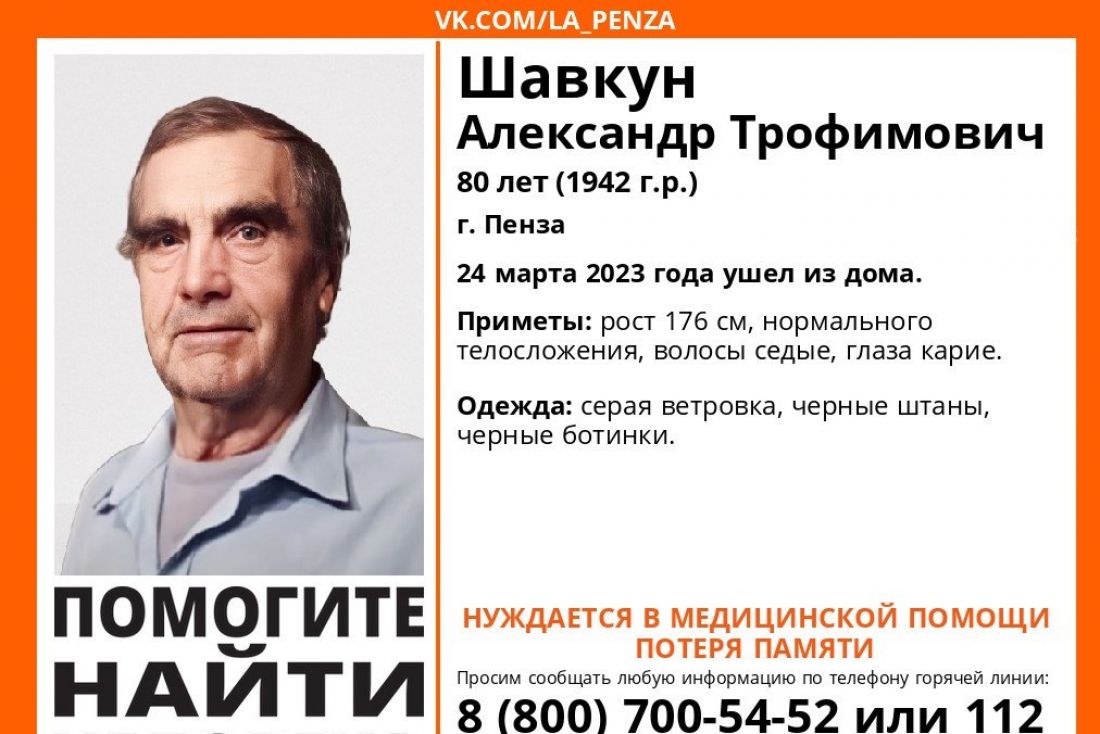 «Пропал Шавкун Александр Трофимович, 80 лет, г. Пенза. 24 марта 2023 года ушел из дома и не вернулся. Потеря памяти! Нуждается в медицинской помощи!» - такая информация опубликована в телеграм-канале пензенского отряда «Лиза Алерт».