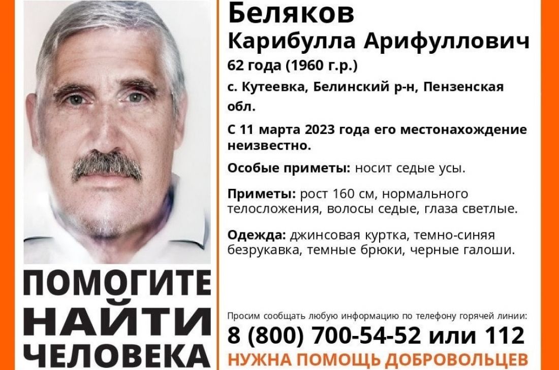 Карибулла Беляков, проживающий в селе Кутеевка Белинского района, пропал 11 марта. Больше двух недель у родственников нет информации о его местонахождении.