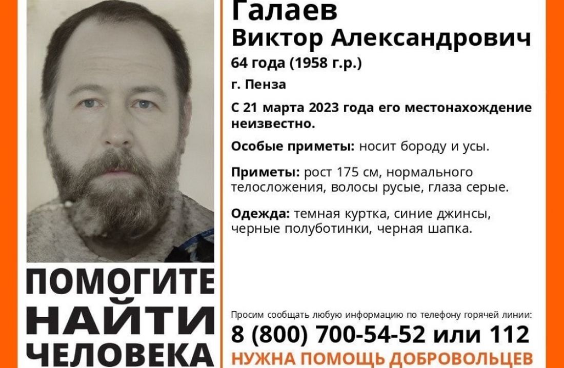 В телеграм-канале «Лиза Алерт Пенза» опубликованы приметы пропавшего: рост 175 сантиметров, нормальное телосложение, русые волосы, серые глаза, носит бороду и усы. В день исчезновения мужчина был одет в темную куртку и синие джинсы, на ногах черные полуботинки, на голове - черная шапка.