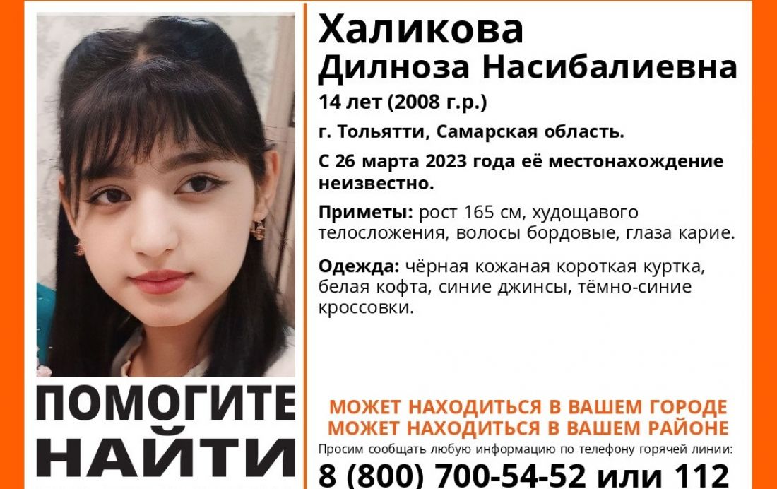 14-летняя жительница города Тольятти Самарской области Дилноза Халикова пропала 26 марта, с тех пор ее местонахождение неизвестно.