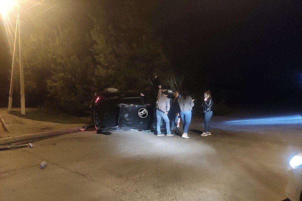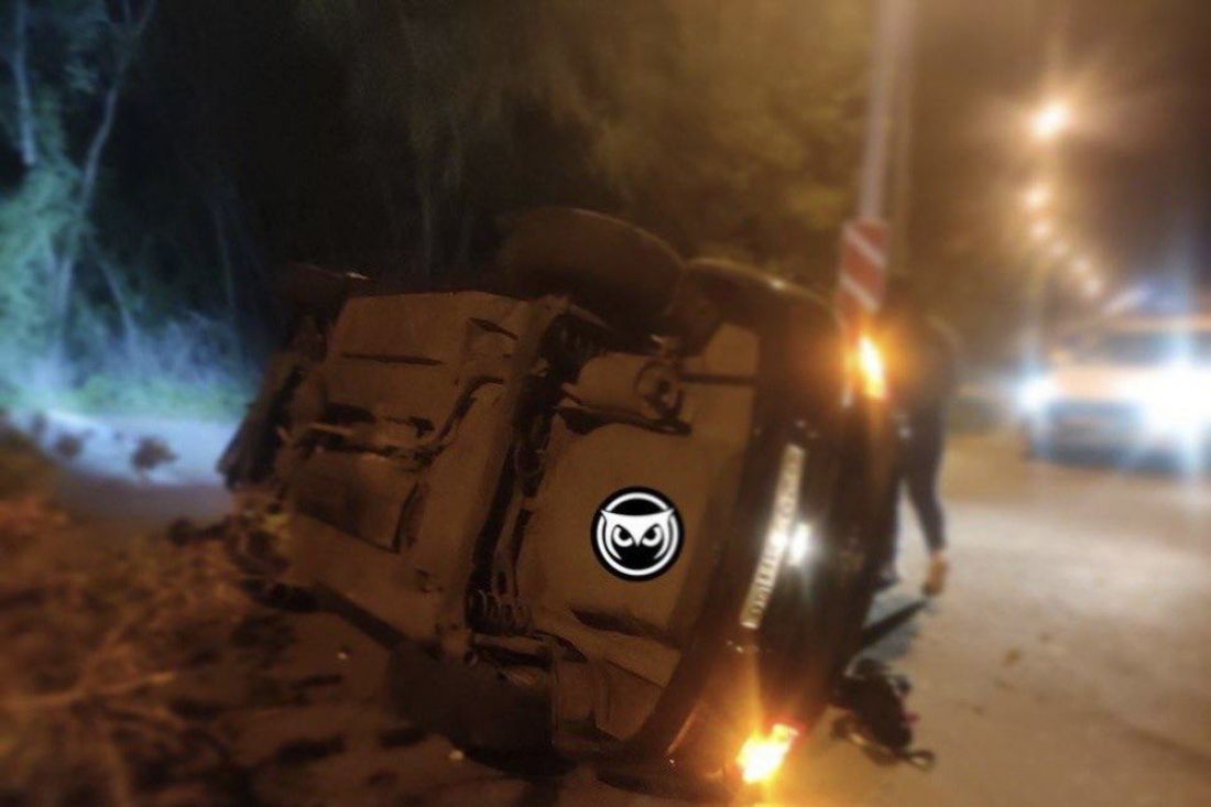 Видно, что легковая машина находится у края дороги, рядом с бордюром. Транспортное средство перевернуто на бок, у него смята крыша и выбиты стекла. Сведений о пострадавших не поступало.