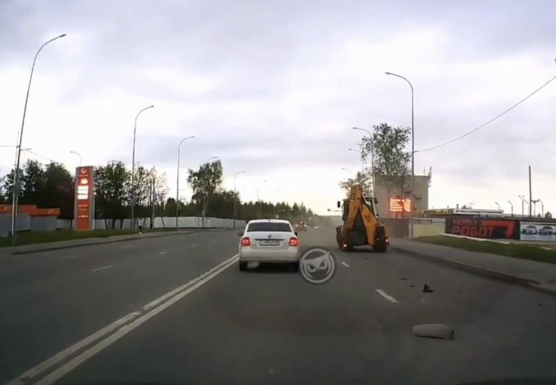 Видно, что спецтехника едет на низкой скорости, вдоль края дороги. Затем звучит резкий хлопок, и у транспортного средства лопается левое заднее колесо. Вверх подлетают куски резины и машина останавливается, немного заваливаясь на бок. Сведений о пострадавших не поступало.