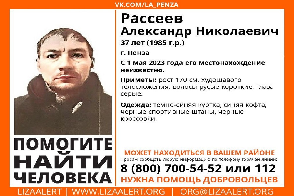 Ориентировка на поиск пропавшего в Пензе Александра Рассеева появилась в телеграм-канале пензенского отделения поискового отряда «ЛизаАлерт». По информации волонтеров, мужчина пропал 1 мая, до настоящего времени его местоположение остается неизвестным.