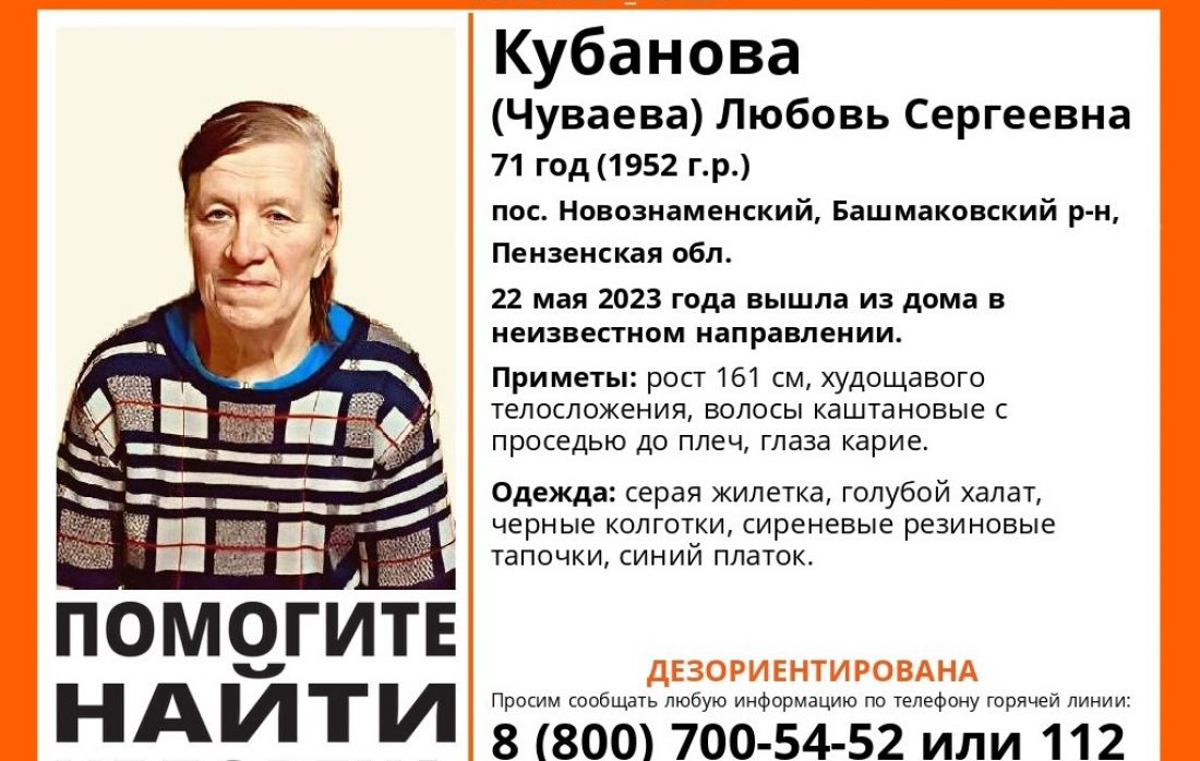 В Пензенской области пропала 71-летняя Любовь Кубанова