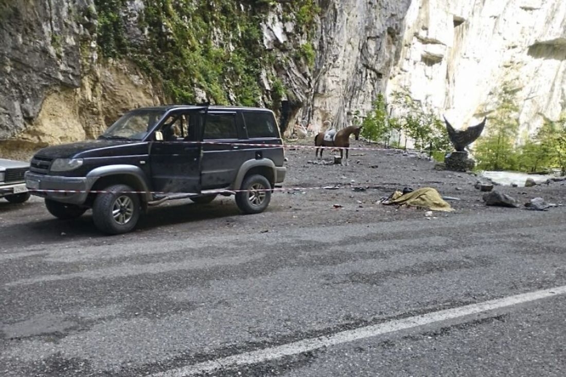 На кадрах запечатлены последствия камнепада. В результате падения камней были разбиты окна машины, погнуты двери и смята крыша. Земля вокруг усыпана осколками стекла и булыжниками.
