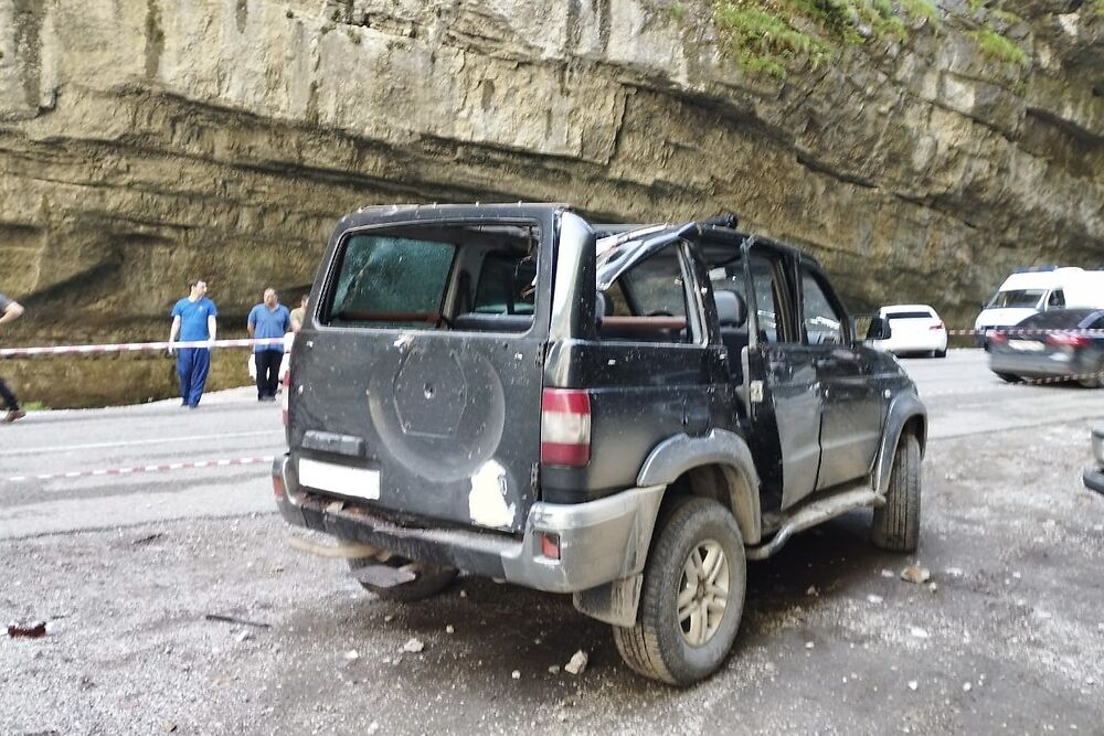 Автомобиль УАЗ, передвигаясь по территории Юпшарского каньона, расположенного на территории Абхазии, попал под камнепад. Фото с места происшествия были опубликованы на официальном сайте министерства по чрезвычайным ситуациям Республики Абхазия.