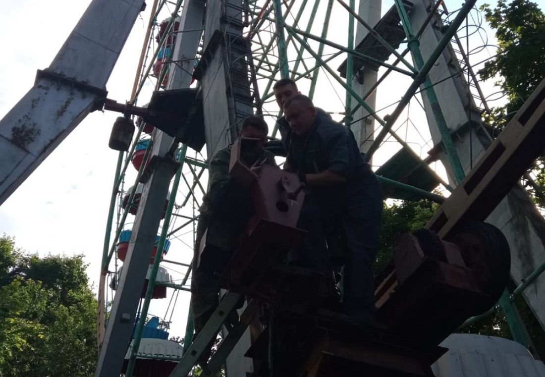 На место происшествия выехали спасатели управления по делам ГО ЧС, которые провели работы по ручному спуску с помощью специального устройства, предусмотренного конструкцией колеса обозрения.