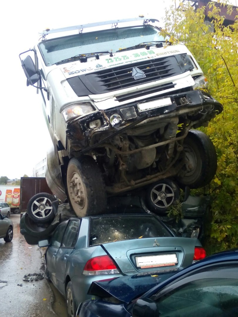 Грузовик с бетонным миксером подмял под себя две легковушки, от удара припаркованные автомобили по цепочке сдали назад.