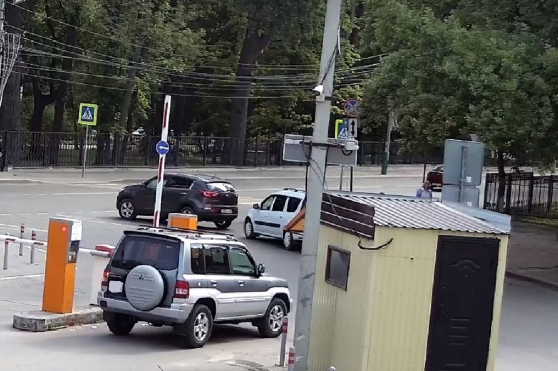 Можно увидеть, как к шлагбауму на парковке подошел мужчина и поднял его. Затем автомобиль марки «Mitsubishi Pajero Pinin» выехал с территории, не оплатив стоянку.