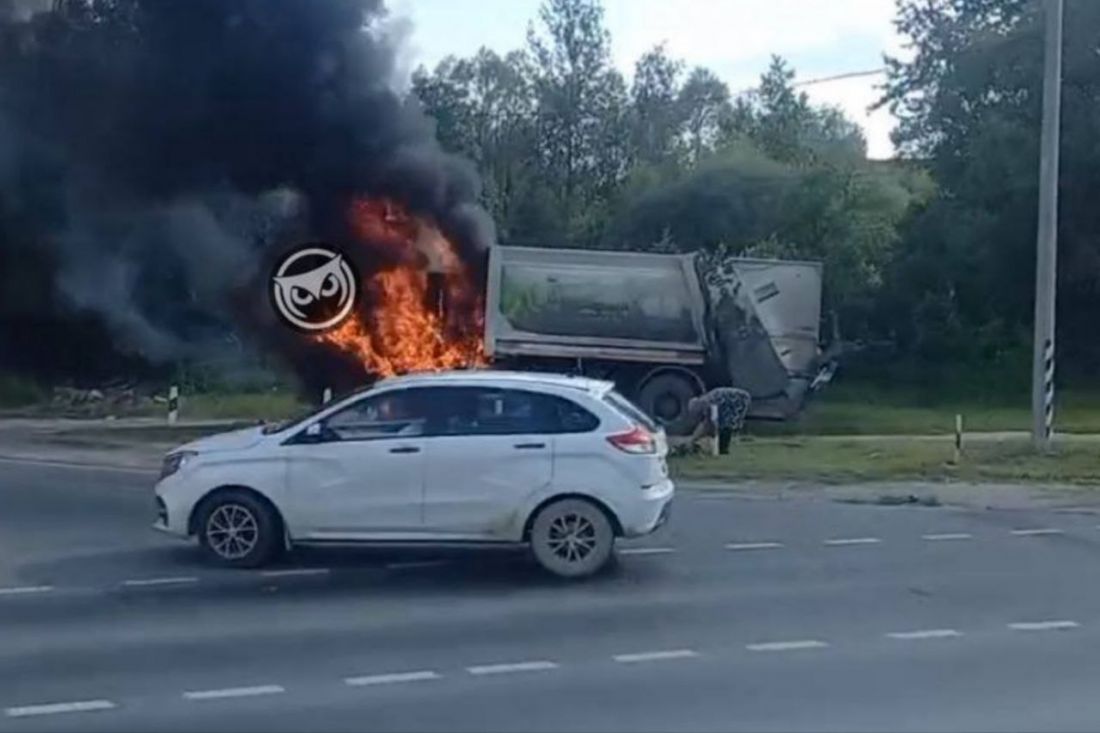 Инцидент случился в поселке Монтажном. Мусоровоз, расположенный посреди проезжей части, загорелся.