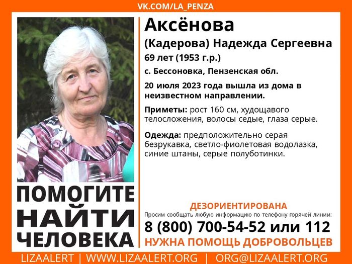 Поисковый отряд «Лиза Алерт Пенза» сообщает об исчезновении 69-летней жительницы села Бессоновка Надежды Аксеновой (Кадеровой).