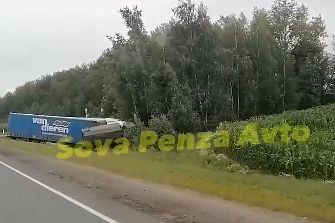 Появилось видео с вылетевшими в кювет фурой и грузовиком под Пензой