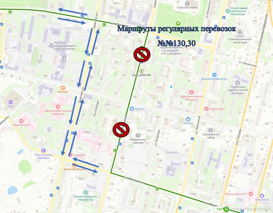 Автобусы малого класса маршрута № 30 и автобусы большого класса маршрута № 130 будут ездить от остановки «ПГУ» (улица Лермонтова) по следующей схеме: Красная – Свердлова и далее по маршрутам в обоих направлениях.