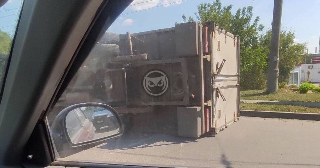 Видно, что грузовое транспортное средство лежит на боку посреди проезжей части. Автомобилистам приходится его аккуратно объезжать.