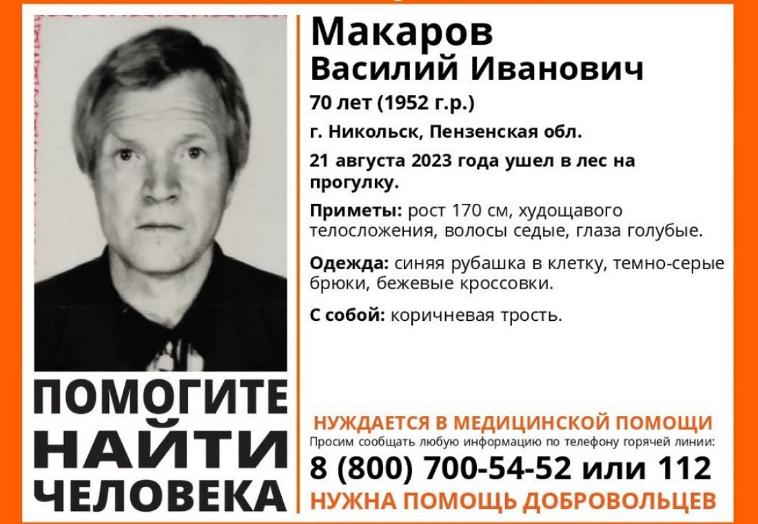 В Пензенской области ведутся поиски жителя Никольска Василия Макарова.