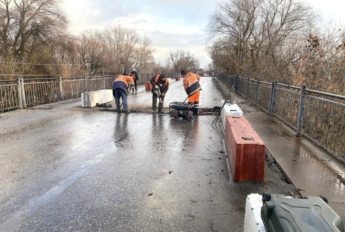 На мосту были раскрыты швы и демонтированы металлические листы, которые их перекрывали. После этого рабочие уложили новое покрытие.