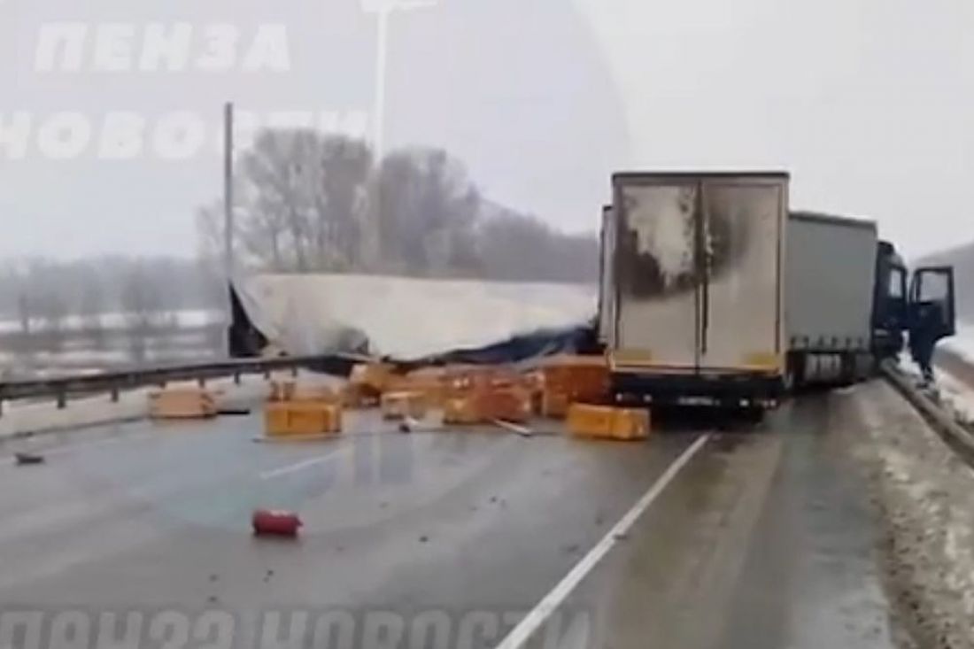 «Фуру развернуло и опрокинуло. Обе полосы заняты. Движение перекрыто. Пробка в обе стороны. Время 11:50», – написал очевидец и опубликовал видео произошедшего в Telegram-канале «Пенза Новости».