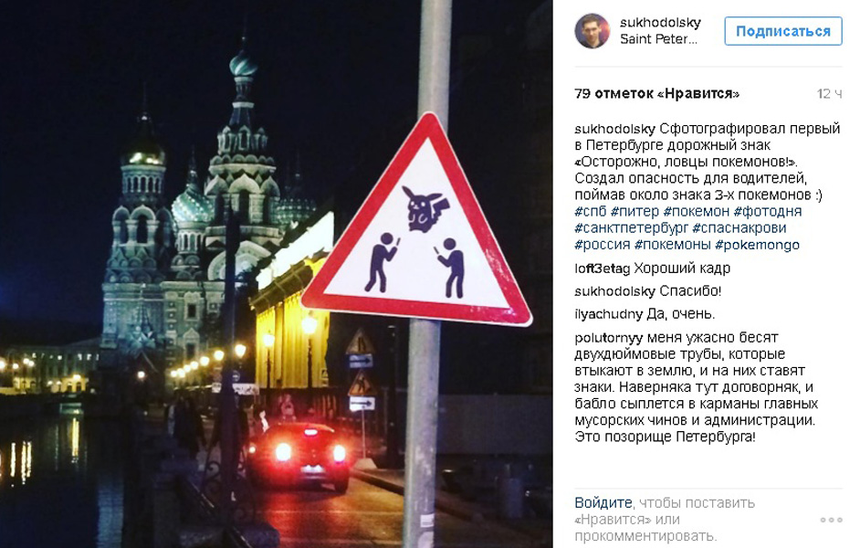 Судя по сделанному снимку, знак установлен на набережной канала Грибоедова. Кстати, автор фото признался, что во время фотосессии сам создал опасность для водителей, поймав около знака трех покемонов.