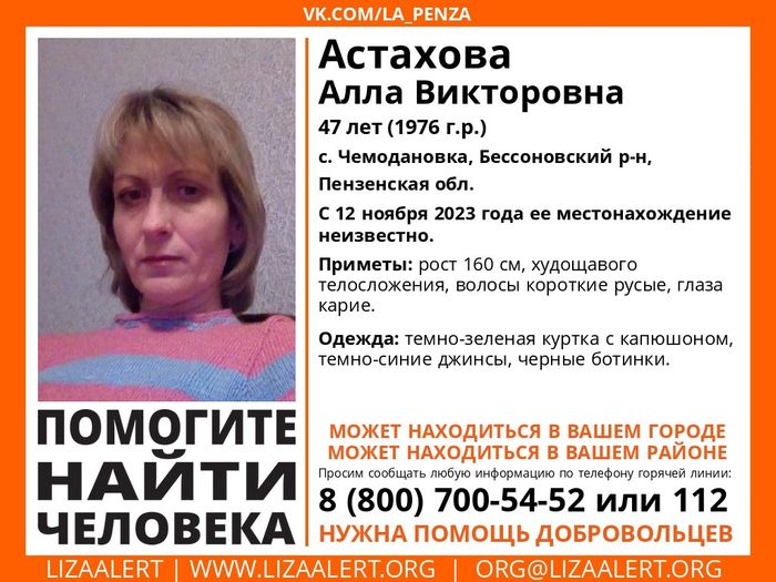 С 12 ноября 2023 года родным и близким 47-летней Аллы Астаховой неизвестно ее местонахождение. Помочь найти ее просят жителей Пензенской области.