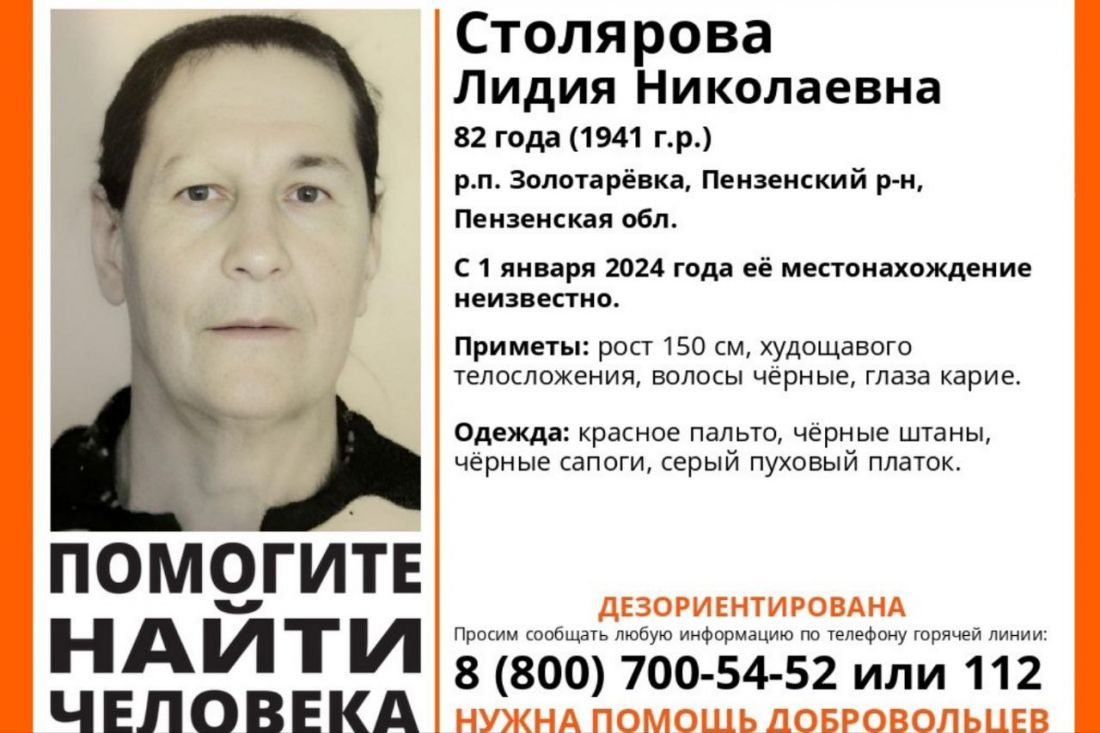 82-летняя Лидия Столярова, проживававшая в рабочем поселке Золотаревка, пропала 1 января 2024 года. В этот день она была одета в красное пальто, черные штаны, черные сапоги. На голове у женщины был серый пуховой платок.