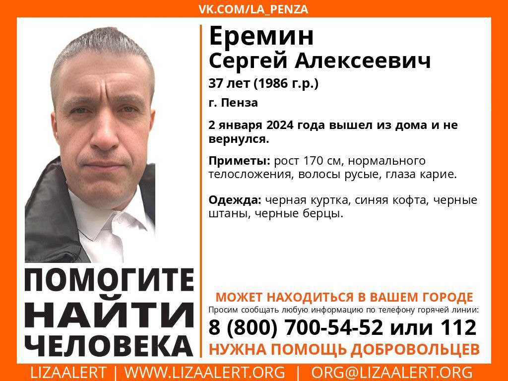 37-летний Сергей Еремин 2 января вышел из дома и не вернулся. Об исчезновении мужчины стало известно из публикации в телеграм-канале поискового отряда «ЛизаАлерт» Пенза.