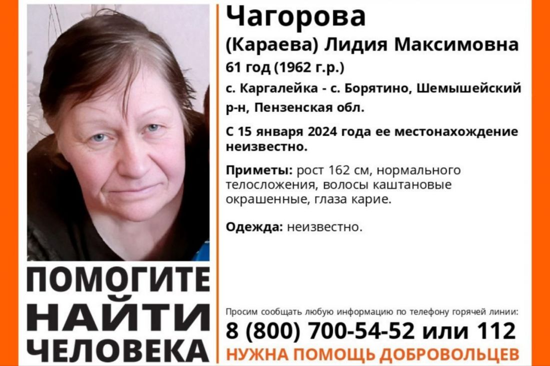 Волонтеры ищут жительницу с. Каргалейка - с. Борятино Шемышейского района Лидию Чагорову (Караеву).