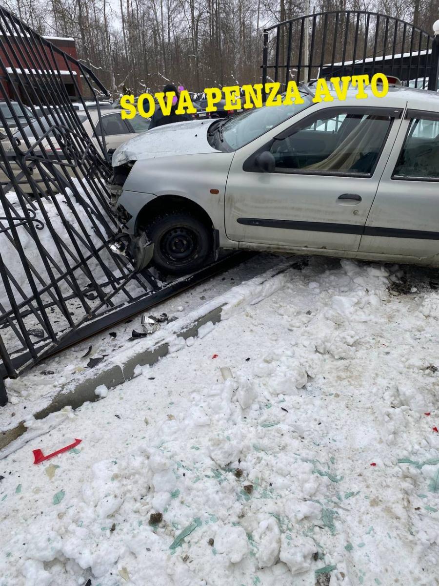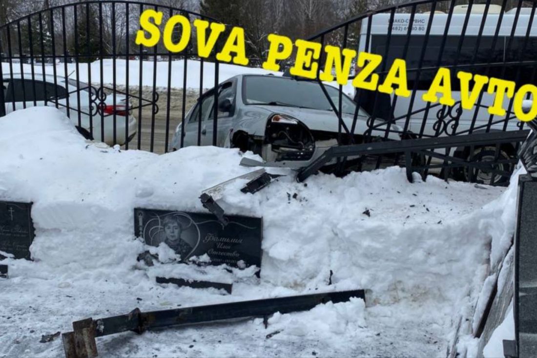 На кадрах видно, что автомобиль влетел в забор, огораживающий территорию кладбища. Передняя часть легковушки серьезно пострадала, ограждение оказалось сваленным в снег.
