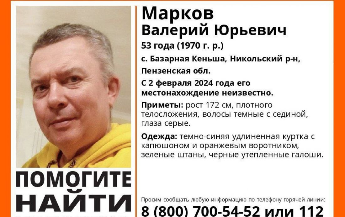 53-летний мужчина пропал в с. Базарная Кеньша, Никольского района, со 2 февраля его местонахождение неизвестно.