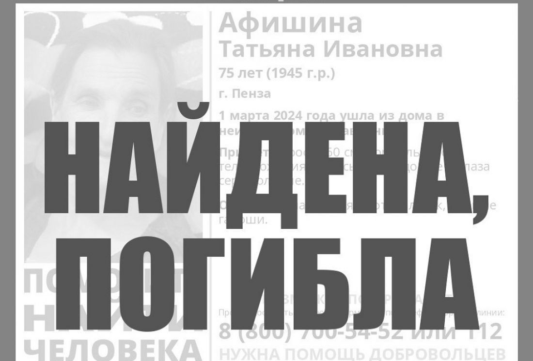 В телеграм-канале поискового отряда «Лиза Алерт» Пензенской области на ориентировке на нее появилась надпись «Найдена. Погибла».