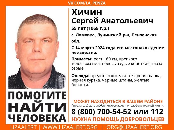 Пензенский поисковый отряд «Лиза Алерт» в четверг вечером сообщил об исчезновении 55-летнего жителя села Ломовка Лунинского района Сергея Хичина.