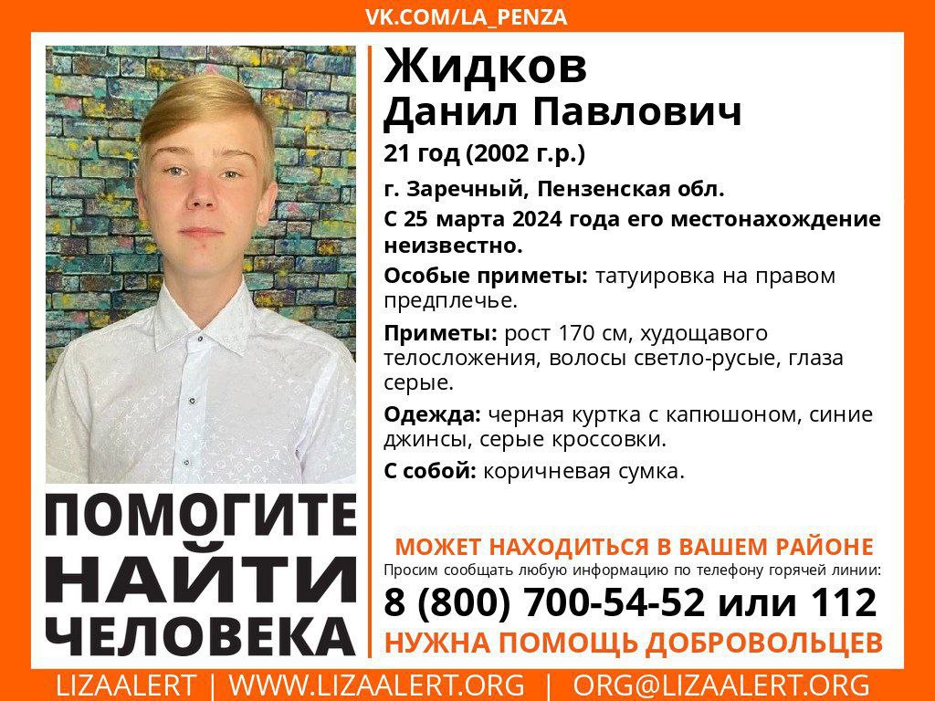 Зареченцев просят оказать содействие в поисках Данила Жидкова, местонахождение которого неизвестно с 25 марта.