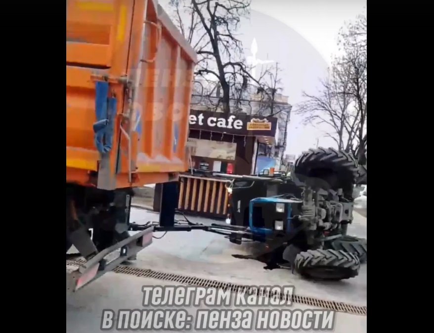 В телеграм-канале «Пенза Новости» появилось видео, снятое очевидцами на улице Московской. На нем запечатлена перевернувшаяся техника - синий трактор лежит на боку неподалку от сквера «Копилка пословиц», рядом с ним стоит самосвал.
