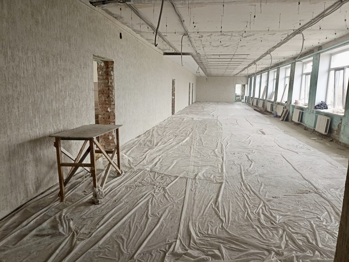 Сейчас на объекте уже произведены демонтажные работы, заменена кровля, смонтированы внутренние перегородки в спецкабинетах, оконные блоки без отделочных работ, выполнена частично штукатурка стен, заливка полов в песчано-цементном исполнении, произведены электромонтажные работы на 2 этаже, заменена внутренняя канализация, проведены частичные работы по внутреннему водоснабжению и подготовительные работы к установке отопительной системы.