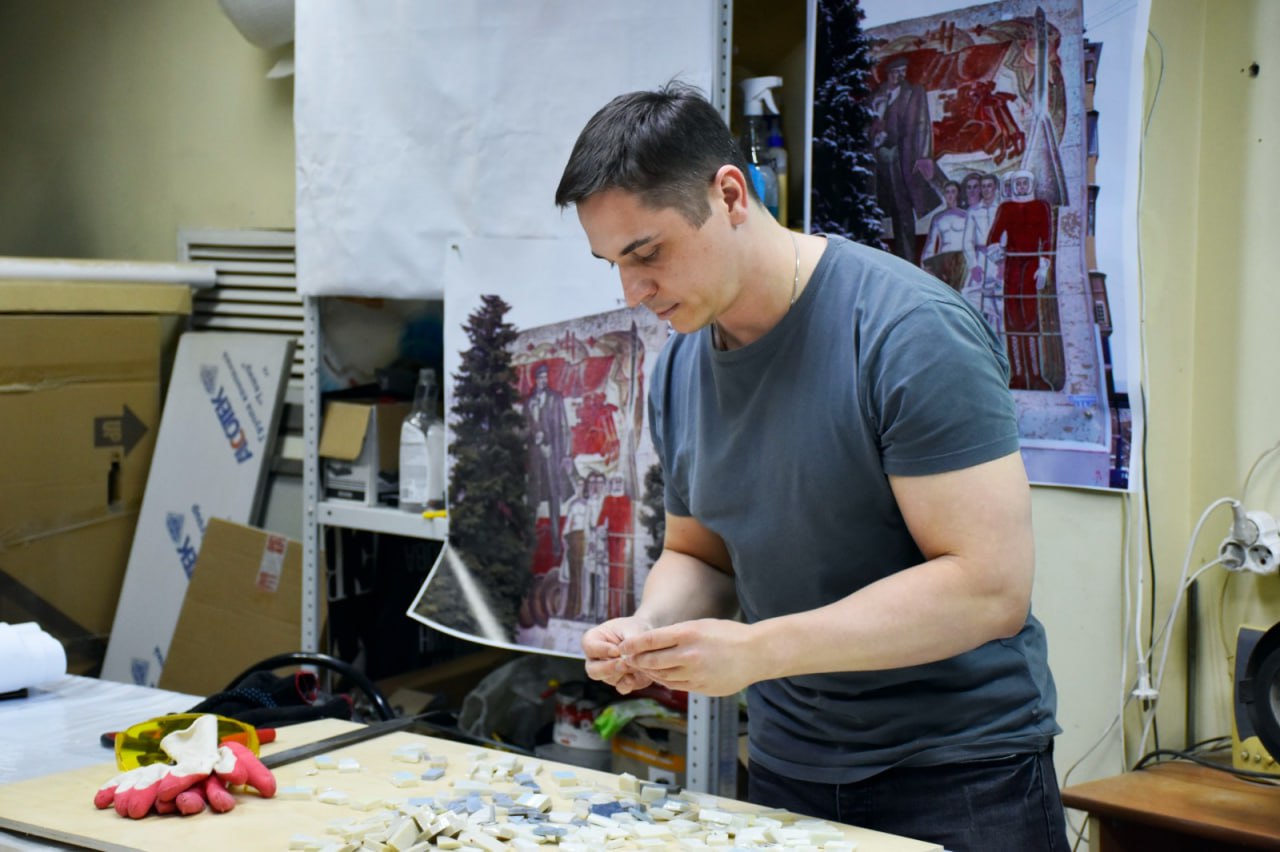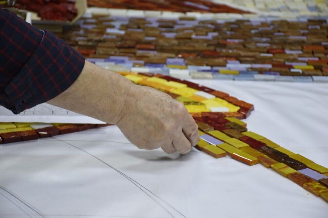Сейчас специалист приступил к работе со смальтой. Она представляет из себя небольшие кусочки цветного непрозрачного стекла, из которых состоит композиция. Изображение восстанавливают в несколько этапов: рисунок выкладывается лицевой стороной вниз, затем заливается клеевым составом, закрепляется на сетку, а после размещается на панель размером 1 метр на 70 сантиметров.