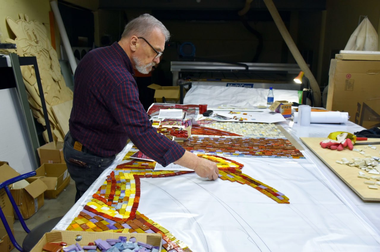 В Пензе художник-керамист Игорь Митяев в мастерской «Добро» занимается реставрацией утраченных фрагментов мозаичного панно, расположенного на улице Карпинского, 1а.