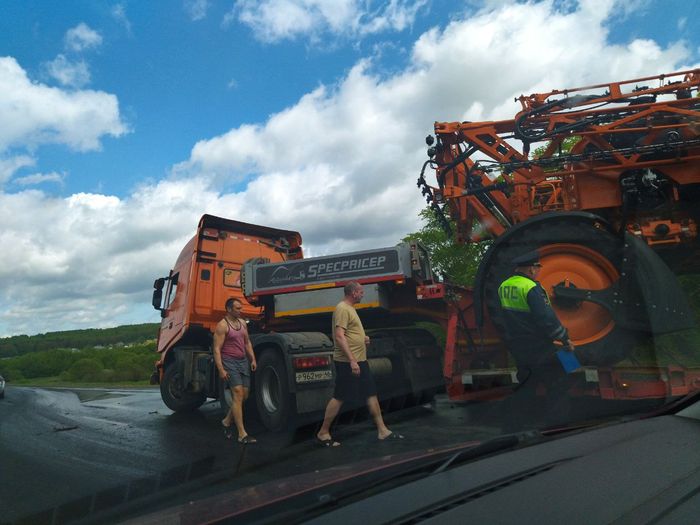 Еще одним участником аварии стал трал, перевозивший сельскохозяйственную технику. У него повреждена передняя часть с правой стороны.