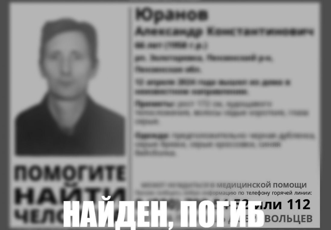 «Юранов Александр Константинович найден, погиб. Выражаем соболезнования родным и близким. Спасибо всем за участие в поиске на месте и удаленную помощь», - такое сообщение появилось под ориентировкой на мужчину в группе поискового отряда «Лиза Алерт» Пензенской области в социальной сети.