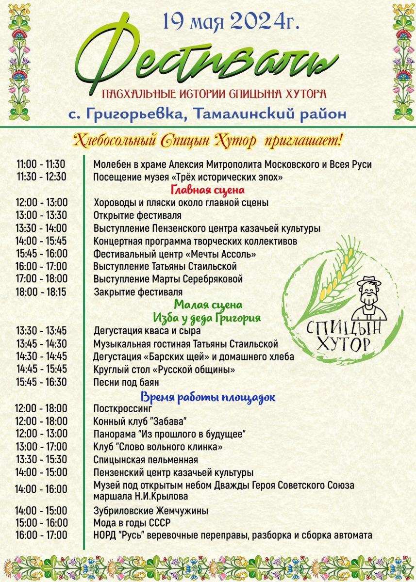 19 мая в селе Григорьевка Тамалинского района Пензенской области состоится Пасхальный фестиваль Спицына Хутора.
