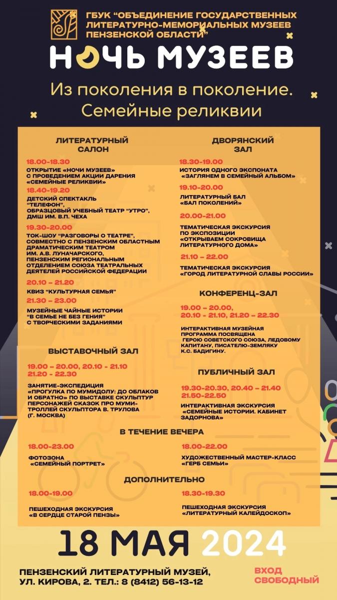 Обширную программу разработал для гостей пензенский Литературный музей. В 18:00 там состоится открытие «Ночи музеев» с проведением акции дарения «Семейные реликвии».