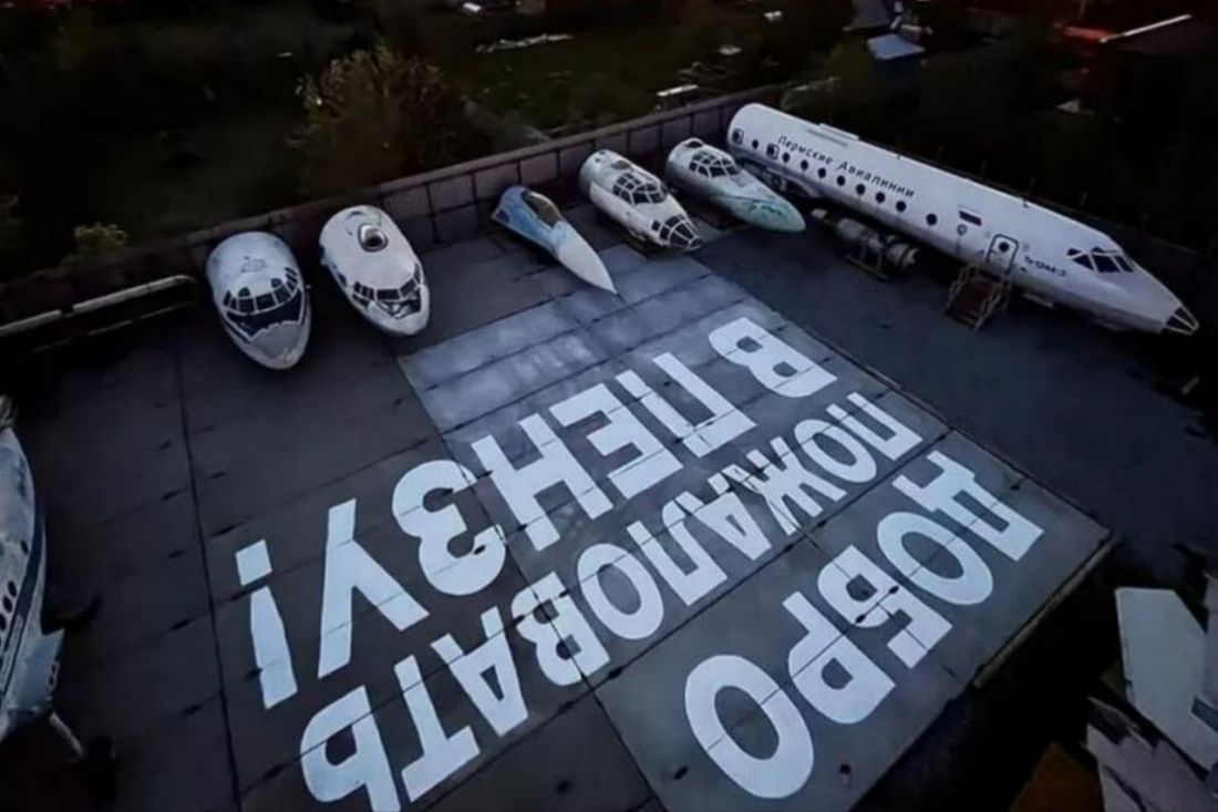 На площадке перед аэропортом в Перми появилась большая шуточная надпись.