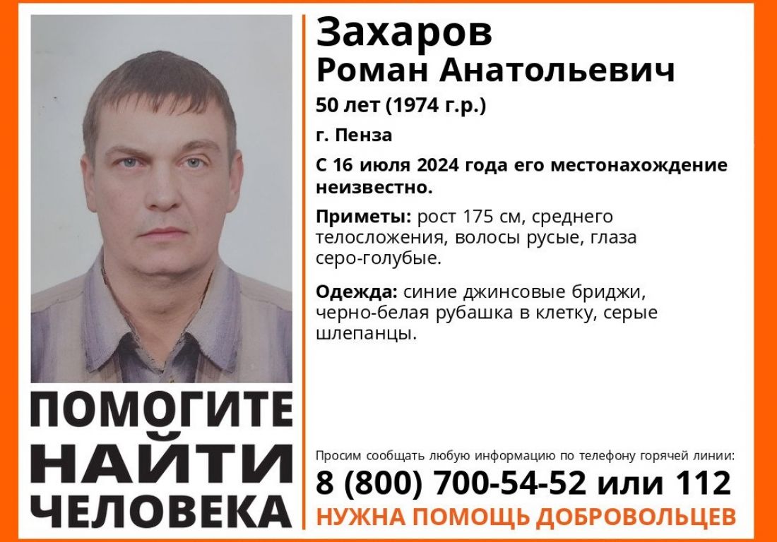 Поисками пропавшего 50-летнего Романа Захарова занимаются близкие, полиция и добровольцы. Ориентировка на него опубликована участниками отряда «Лиза Алерт» Пензенской области.