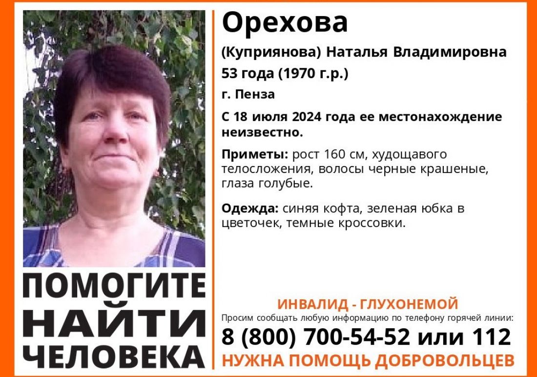 В телеграм-канале поискового отряда «Лиза Алерт» Пензенской области сообщается, что местонахождение 53-летней Натальи Ореховой (Куприяновой) неизвестно с 18 июля.