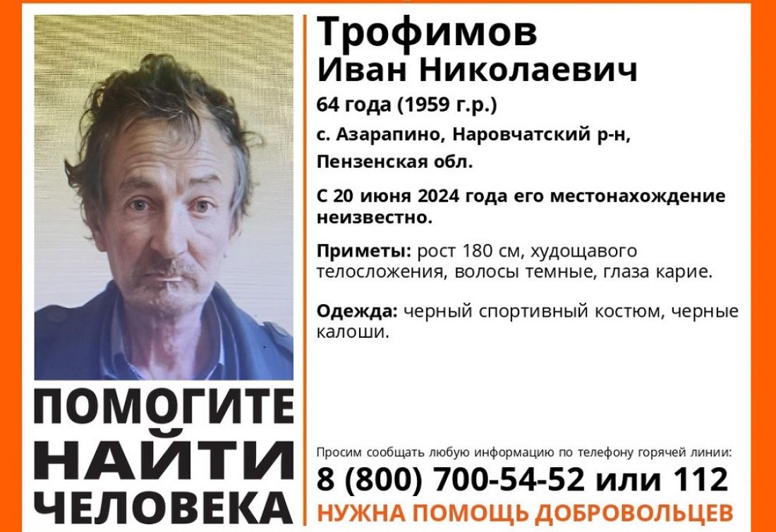 Поисками 64-летнего жителя села Азарапино Наровчатского района Ивана Трофимова занимаются его близкие, полиция и добровольцы. В группе поискового отряда «Лиза Алерт» Пензенской области в соцсети указаны приметы пропавшего.